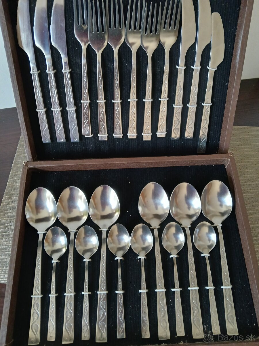 Retro jedálenský príbor Solingen pre 12 osôb, 72 dielny - [26.1. 2026]predám retro jedálenský príbor Solingen pre 12 osôb, 72 dielny značený Edelstahl Rostfrei 18/10 s certifikátom uložený v pôvodnom kufríku, príbor je striebornej farby po stranách rúčok zlátený, pár krát použitý nepoškodený krásny zachovalý stav, cena + pošta