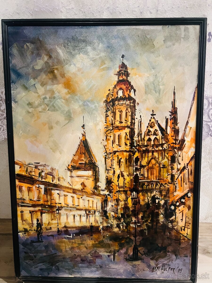 Predám originálny obraz maľovaný na plátne, mestská historická scenéria (podpis F. Holzer, rok 2005).