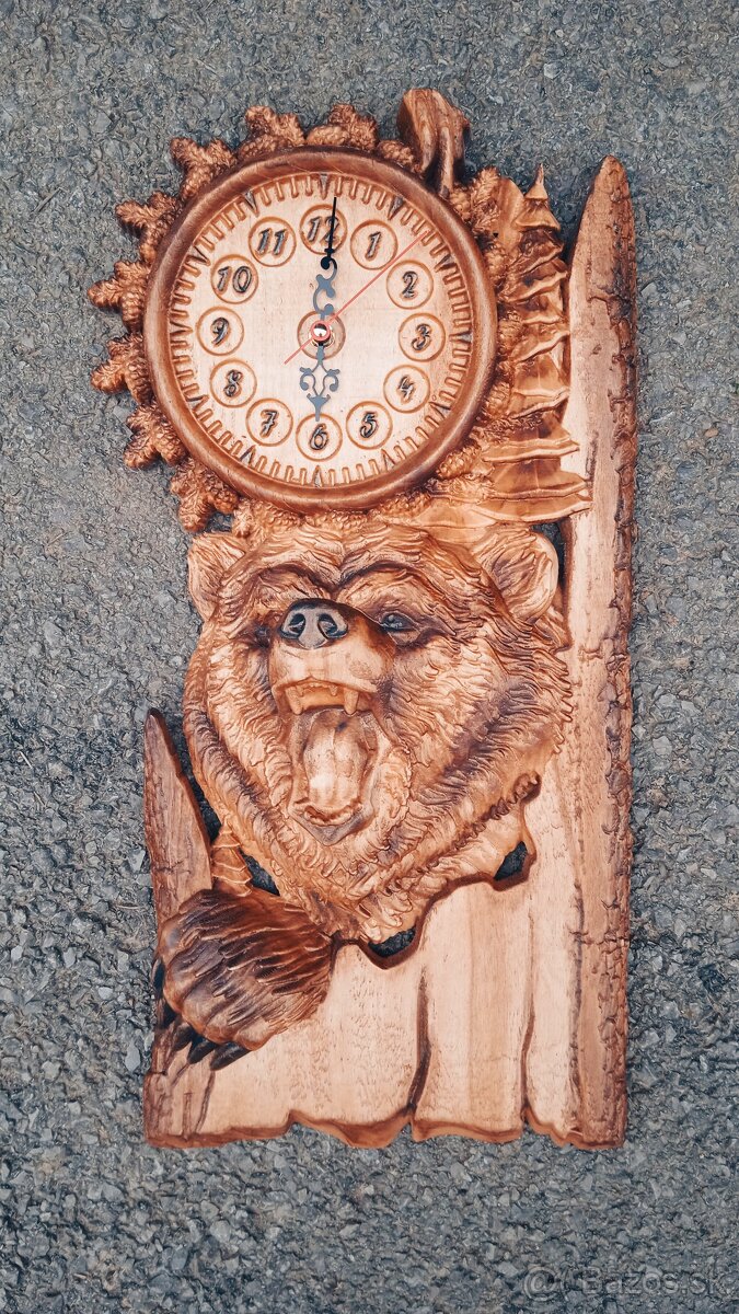 Ponúkam na predaj drevorezba obraz nástenné hodiny medveď rozmer 60x28x5cm cena je 100€+pošta materiál lipa alebo osobný odber Chlebnice
