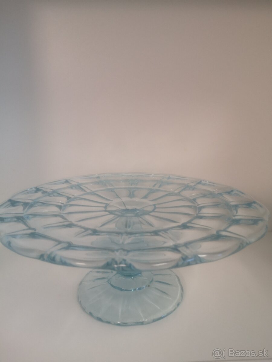 Retro, svetlo-modrý podnos na tortu. Rozmery: 27 cm x 11 cm. Stav dobrý, sklo bez oťukov, na podstave výrobná vada v skle - zanesenie farby/viď foto/.