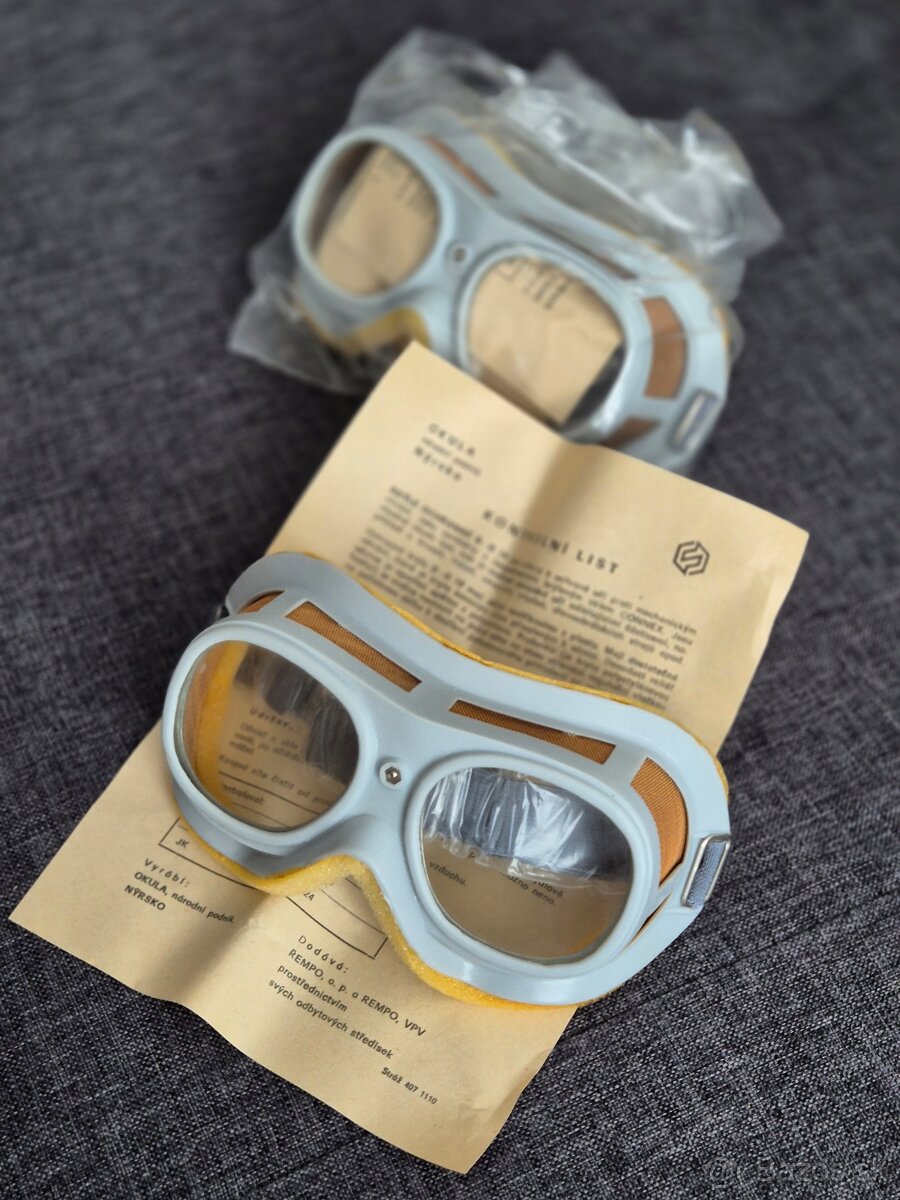 Ochranné okuliare Okula vyrábané okolo 70-80 rokov 20. storočia. Sú vyrobené z plastu, skla a nastaviteľného elastického popruhu, penová výplň. Nové nepoužívané s kontrolnym listom zabalené. Sú vhodné na retro rekvizity a dekorácie, ale dajú sa použiť podľa určenia.