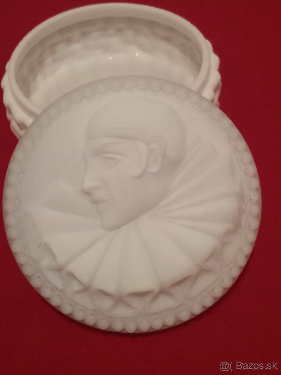 Ponúkam na predaj art deco dózu / šperkovnicu/ s vrchnákom z bieleho, mliečneho skla. Na vrchnáku portrét Pierota. Výška 4,6cm, priemer 6,5cm, nepoškodená. Cena 27€ + poštovné. V prípade záujmu ma kontaktujte na mail, tel. číslo je neplatné. Pozrite si aj moje ďalšie ponuky..