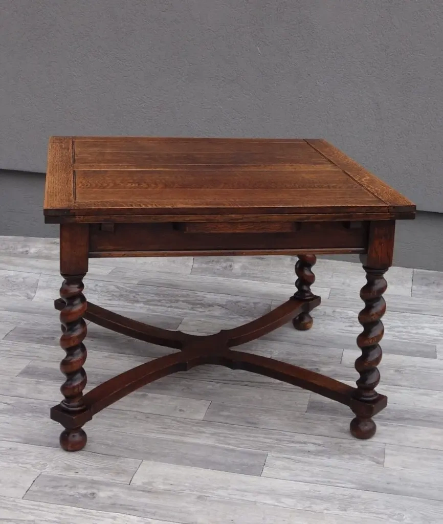 Tento starožitný stôl vyrobený s precíznosťou, má podmanivý dizajn krížových nôh. Je rozkladací z jačmenného dubu z 20. rokov 20. storočia. Je strednej dubovej farby s krásnou dubovou kresbou. Má 2 výsuvné listy, ktoré sa vytiahnu jednoduchým pohybom. Stoji na mohutných jačmenných otočných nohách s nosidlami „X“. Stôl by po úplnom roztiahnutí s oboma chlopňami mohol pohodlne usadiť 6 osôb , ak vám nevadí byť blízko. Stôl môžete použiť s jedným alebo 2 listami v závislosti od počtu hostí, ktorých zabávate .Tento stôl dodá šarm a charakter do každej miestnosti . Používaný . Výška – 75 cm , dĺžka – 107 cm , šírka – 107 cm . Pri rozložení dĺžka – 182 cm .Dovoz Holandsko. Dovoz až k Vám domov viem v rámci Slovenska zabezpečiť po dohovore zadarmo . Pozrite všetky moje inzeráty možno zaujme aj niečo iné. Uprednostňujem telefonický kontakt pred sms a emailmi. Všetko je o dohode .