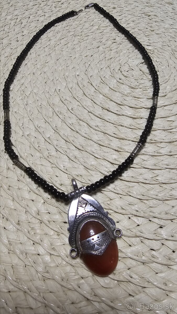 etnický kmeňový náhrdelník Tuaregov z Afriky (konkrétne zo severnej alebo západnej časti), často označovaný ako berberský šperk, s oválnym príveskom s kamienkom a korálkami. Identifikačné značky na zadnej strane prívesku sú tradičné symboly Tuaregov, ktoré označujú remeselníka alebo rodovú príslušnosť, a nie oficiálny punc pre rýdzosť striebra.