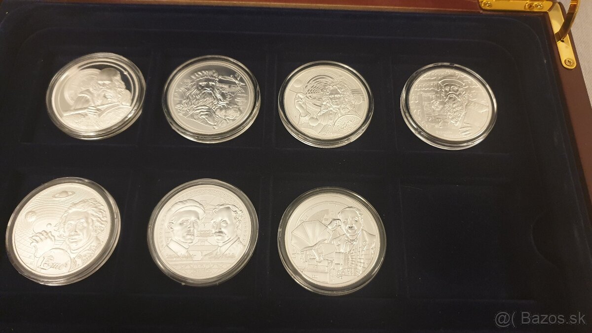 Ponukam na predaj strieborne mince zo serie Ikony Inspiracie:Galileo,Sir Isaac Newton, Leonardo Da Vinci,Albert Einstein,Bratia Wrightovci,Johannes Gutenberg.Kazda minca zo serie ma naklad 10 000ks na svete.Priemer minci je 39,00mm.Hmotnosť v unciach 1oz(31,1g) Rýdzosť 999 cisteho striebra, mince su v original kapsuliach,nove,komplet seria a ihned k odberu.. pozri aj dalsie moje inzeraty...