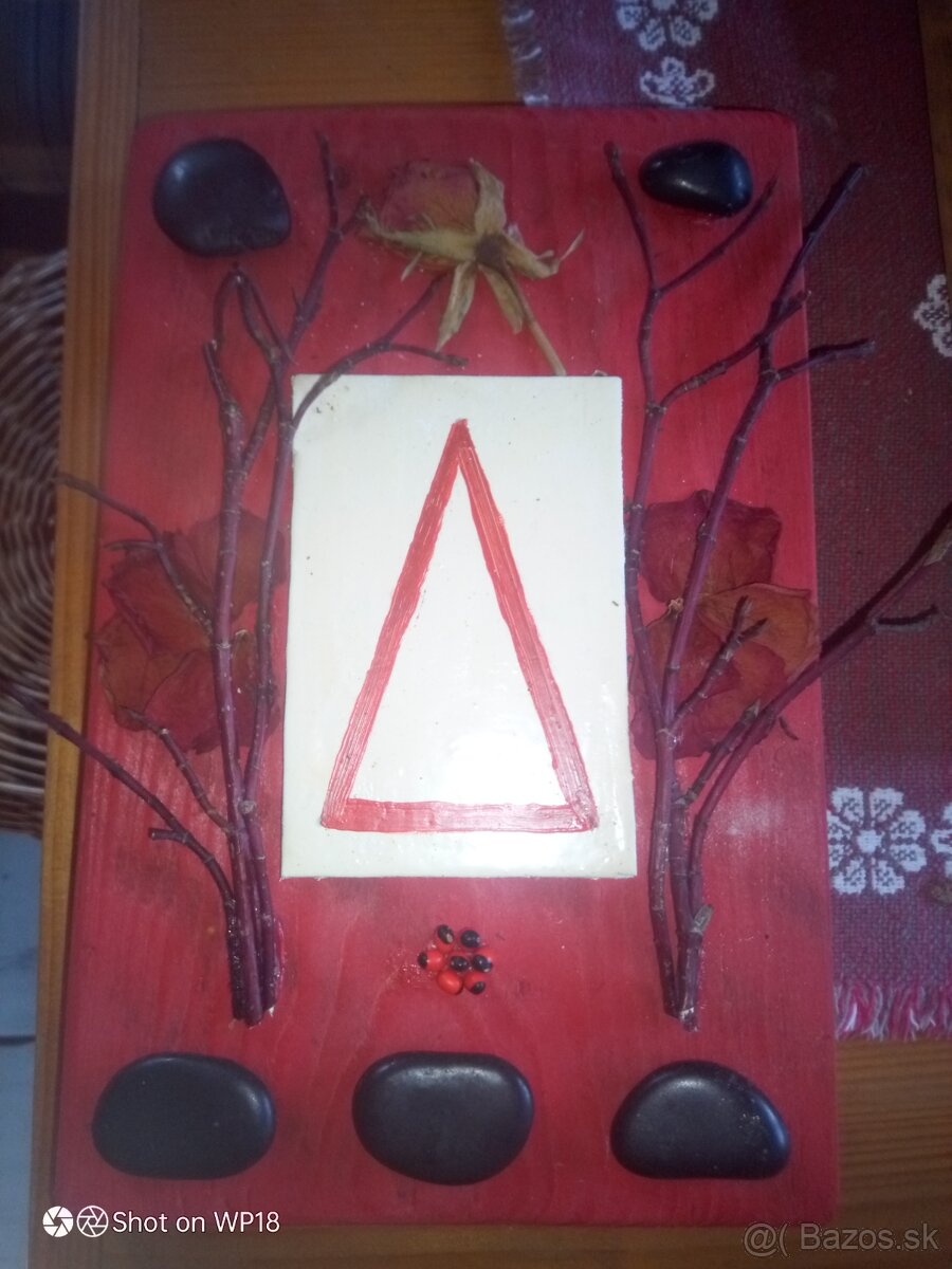 Original robene na masivnom dreve, morene odtienmi a lepene. Symboly su alchymicke znacky živlov.