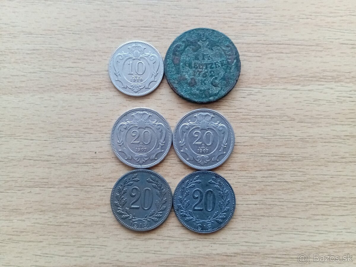 Predám 10 Heller 1910 a 1 Kreuzer 1762 K za 4 Eura, 20 Heller 1907,1918 za 5 Eur/kus