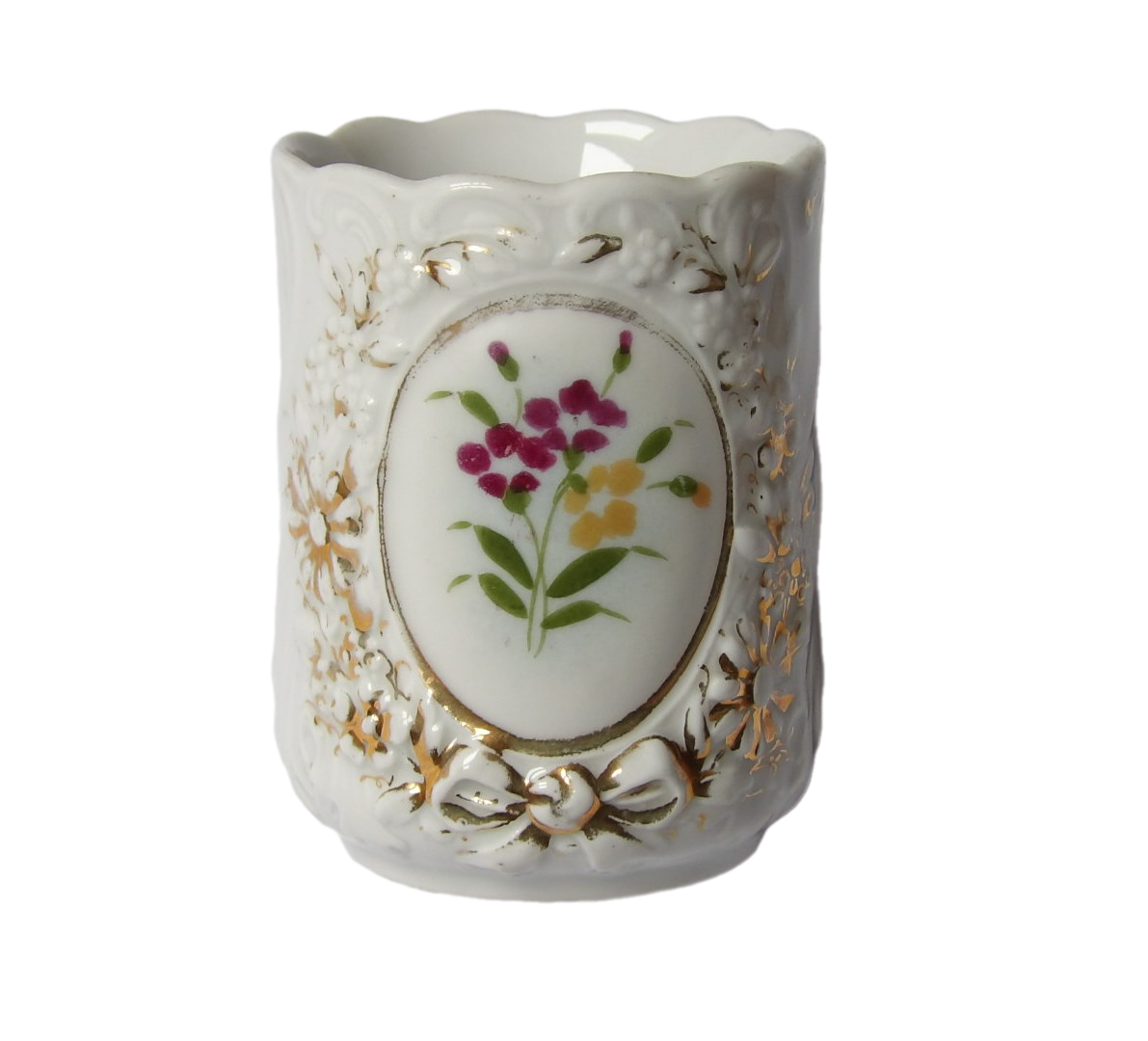 Starý hrnek z 20 tých let 20. století, glazovaný porcelán zdobený květinovým dekorem celoplošně reliéfně tvarovaný a zlacený, výška 9 cm, průměr 7 cm, značený, kvalitní zabalení je samozřejmostí, dobírka Packeta od 5,-€.