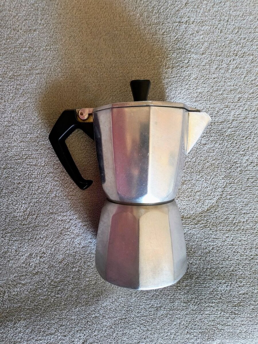 mocca kávovar • na prípravu kávy espresso • objem 340 ml • 6 šálok • výška 20 cm • materiál: hliník • ergonomická rukoväť zo žiaruvzdorného plastu • silikónové tesnenie • vhodný pre plynové, elektrické a sklokeramické sporáky