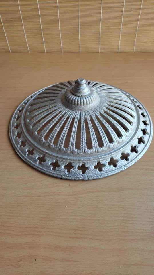 Predám starý liatinový kryt – vetraciu ružicu na kachľovú pec, veľkosť 34 (Ø 34 cm). Masívny odliatok s ozdobnými štvorlístkami a radiálnymi štrbinami, originál zo starej pece, bez prasklín, pevný a zachovalý. Vhodný na opravu, doplnenie alebo ako dekorácia. Osobný odber alebo pošlem poštou. Cena: 60 €.