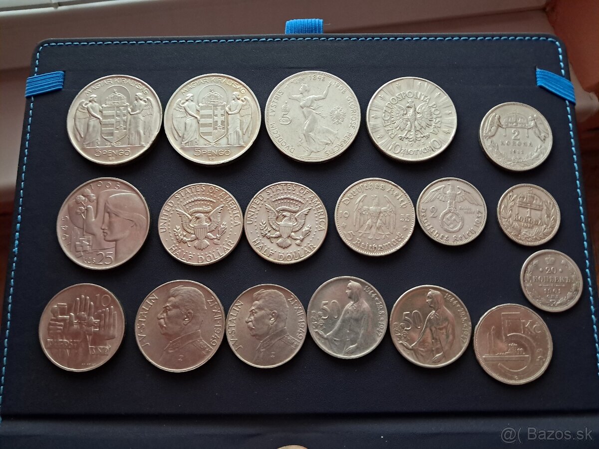 predam strieborne mince mix...celok 320eur alebo kusovo Madarske kralovstvo 5 pengo 1939 Horty 45e, RU 5 jub. korona 1908 55e, 2 korona 1912 KB 20e, 1 korona 1915 KB 10e, Polsky stat 10 zlotych 1935 Pilsudski 40e, USA 1/2 dolar 1964 25e, 1967 9e, Nemecka ríša 5 reichmark 1935 30e, 2 reichmark 1937 13e, Ruske carstvo 20kop 1901 5e, Československo 5kč 1928 10e, 10kčs 1964 snp 15e, 50kčs 1947 snp 10e, 50kčs stalin 1949 15e,100kčs stalin 1949 15e, 25kčs 1965 oslobodenie 20e