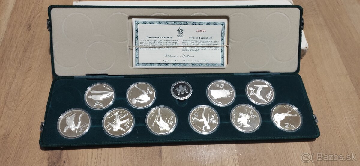 Predám sadu 10 strieborných mincí s motívom zimných olympijských športov, zadná strana mince je kráľovná Elizabeth ll, Canada olympijské hry Calgary 1988. Vyrazené v kanadskej kráľovskej mincovni. S nominálnom 20$, každá strieborna minca má 1oz (31,1 gram) čistého striebra, spolu 10oz striebra. Mince sú s certifikátom pravosti v semišovej etui, každá strieborna minca je v plastovej bubline.