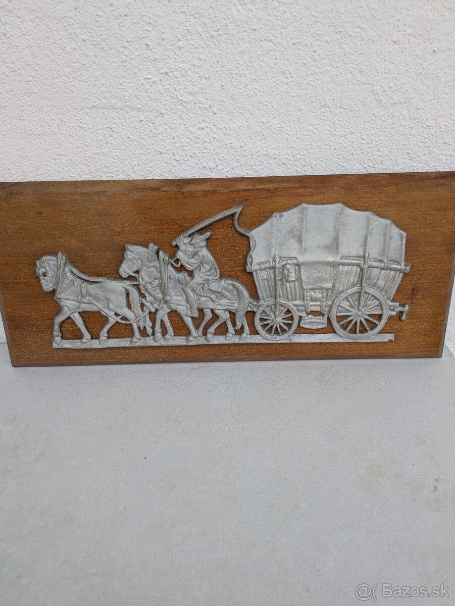 Predám hliníkový odliatok s motívom kone, koč, dostavník na drevenom podstavci v tvare obrazu.