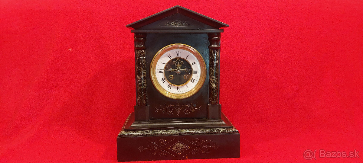 Mramorové krbové hodiny z konca 19 st. Funkcia neskontrolovaná, chýba klúčik.