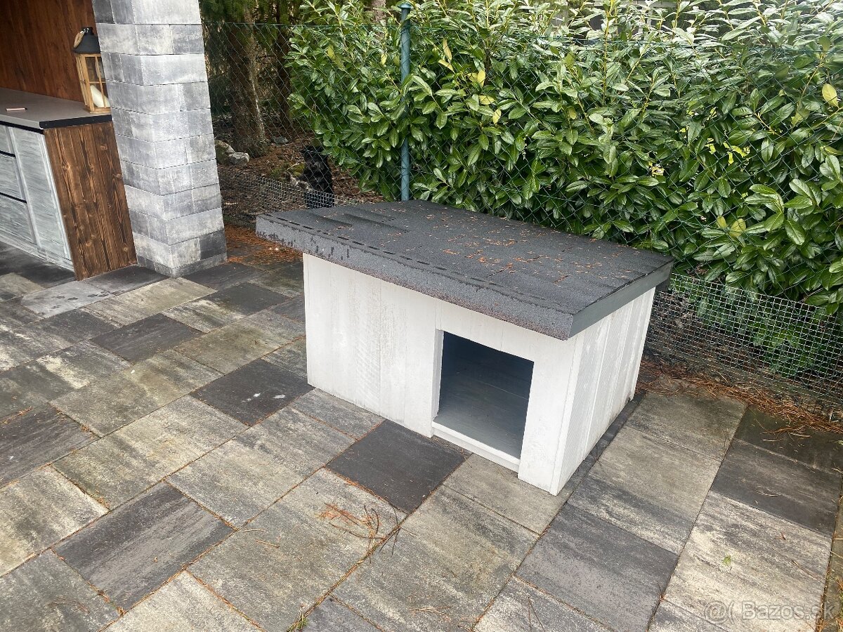 Predám psiu budú. Zateplená, odnímateľná strecha pokrytá šindlom. Šírka 120, hĺbka 80, výška 50 cm. Materiál sibírsky smrekovec o hrúbke 22mm. Náter biela eco farba.