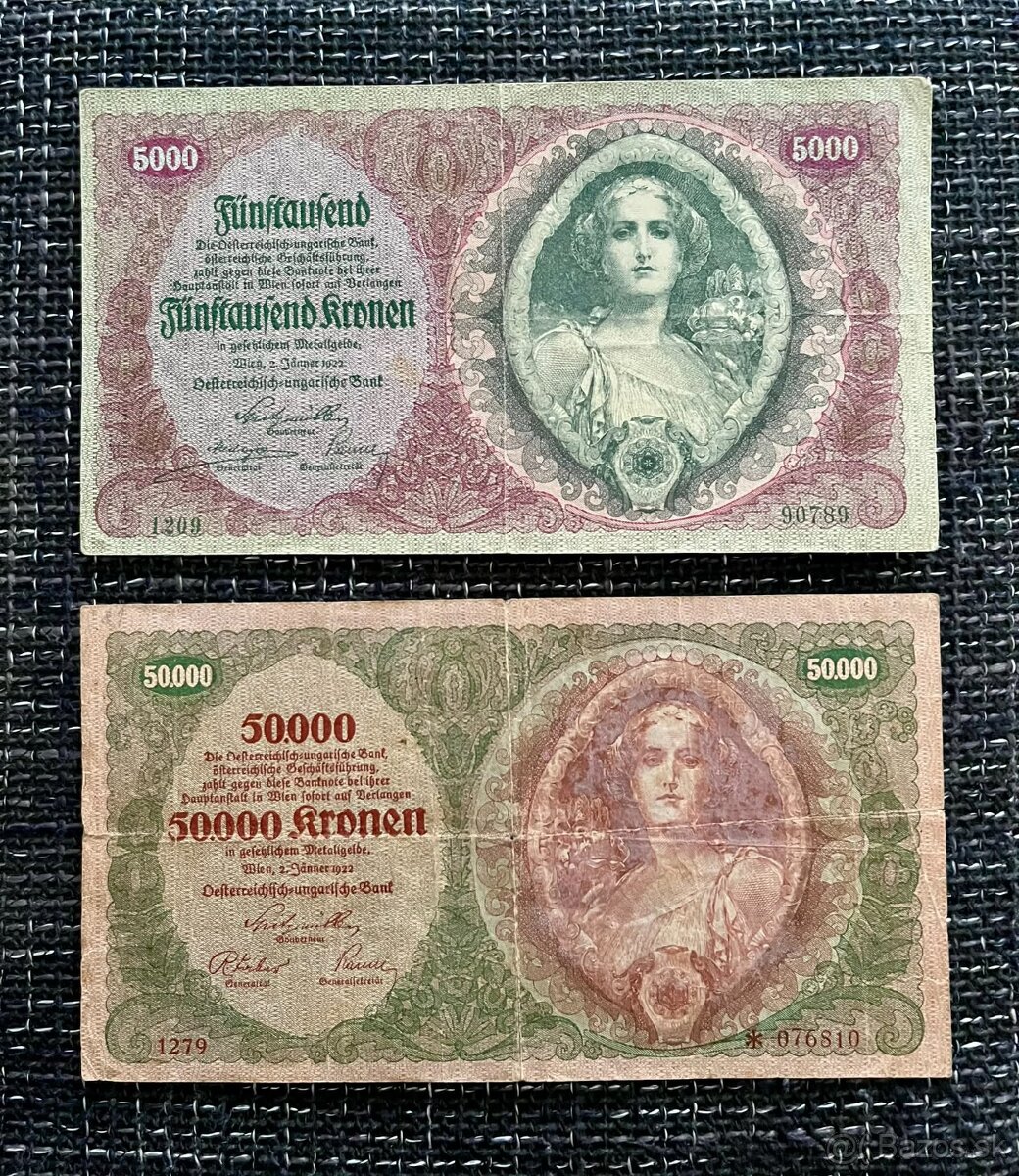 Predám bankovky 5000 a 50000 korun rok 1922 . Platba na účet , +pošta ...v ponuke mám aj iné inzeráty..kliknite na moje meno