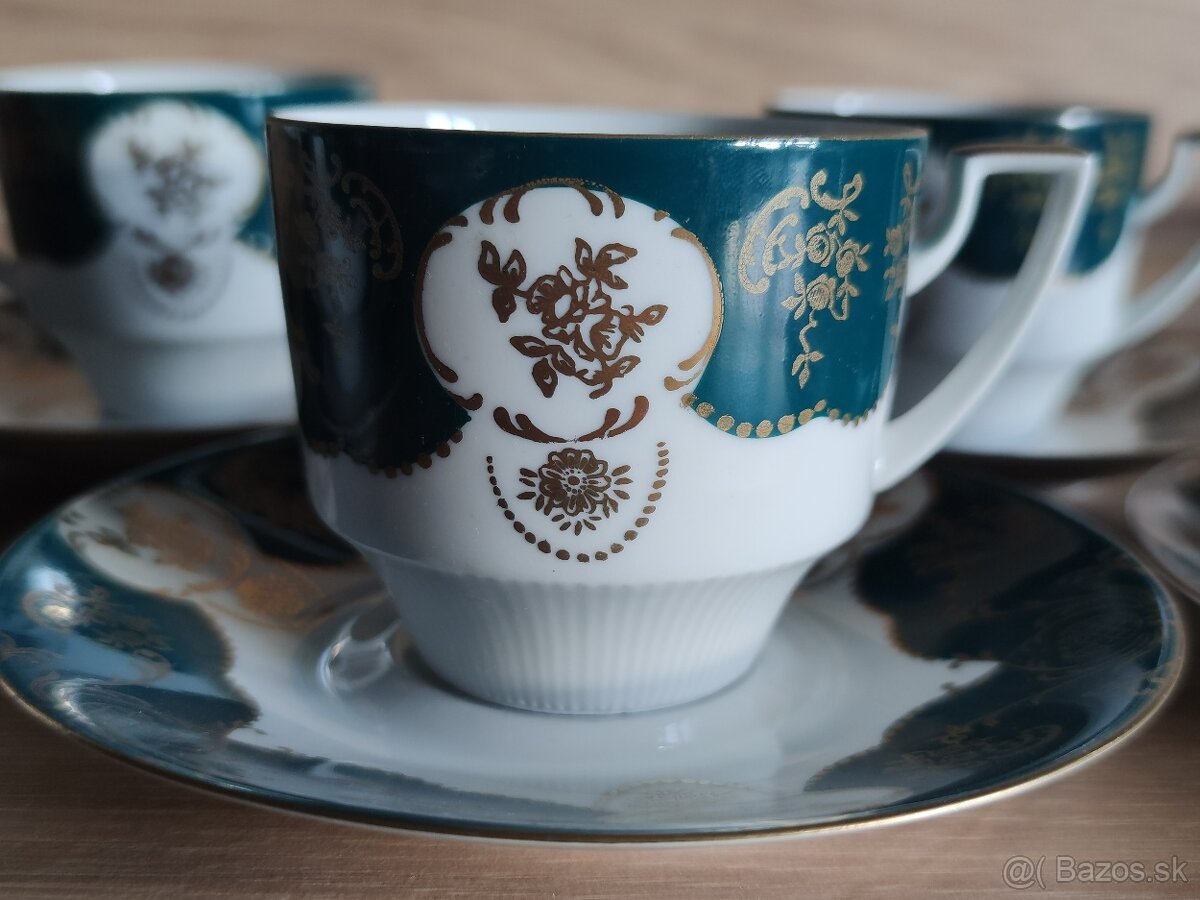 Porcelánová kávová sada JSK - [17.1. 2026]Top stav, bez poškodení. Made in Stružná Czekoslovakia. 6 ks šálka s podšálkou so zlato-zeleným zdobením.