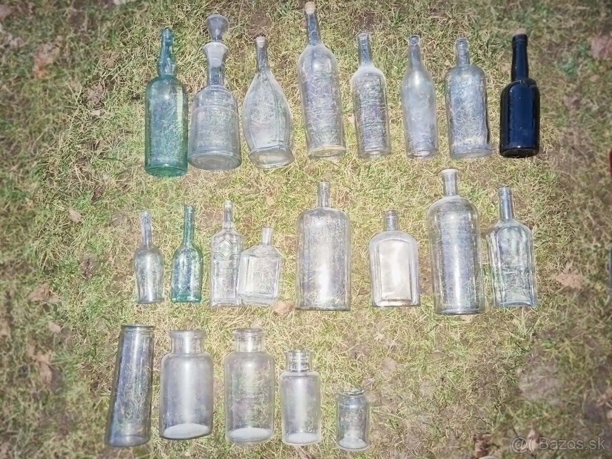 Rôzne staré fľaše, pálenkové, lekárenské, zaváracie poháre