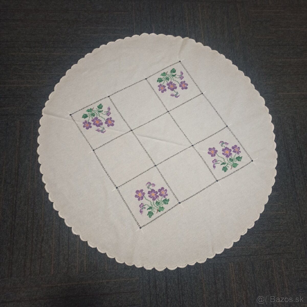 Predám výšivky, obrusy a súpravy, béžová rozmery 29x47 cm, 33x56 cm, 30x100 cm a 35 x117 cm, žltá 75x75 cm a 135x135 cm, zelená 30x45 cm a 7Ox30 cm, fialka s ažúrou štvorec 93 cm a fialka okrúhly 85 cm.