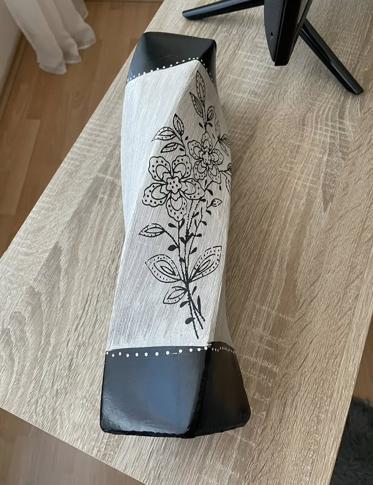 Retro váza - [24.2. 2026]Celodřevěná váza ze 60 tých let 20. století na nízkém čtvercovém soklu (rozměr 13,5 x 13,5 cm), zdobená geometrickým dekorem, celková výška 59 cm, poškozená na jedné hraně - viz foto a dvě menší oděrky na těle, dobírka Packeta 6,-€.