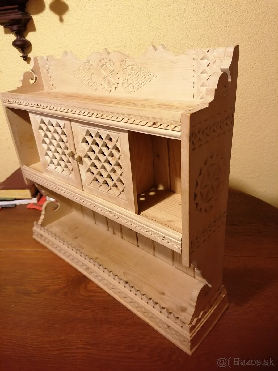 Predám krásnu drevenú ručné vyrezávanú poličku, V 44 cm, dĺžka 50cm, hĺbka 12 cm