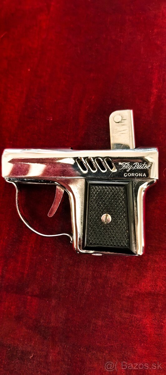 Predám originálny benzínový zapaľovač **Corona Fly Pistol** v tvare pištole. Ide o retro model z 50.–60. rokov, plne funkčný, vhodný pre zberateľov aj ako štýlový doplnok. Kovové telo, pekný stav, mechanika funguje hladko.