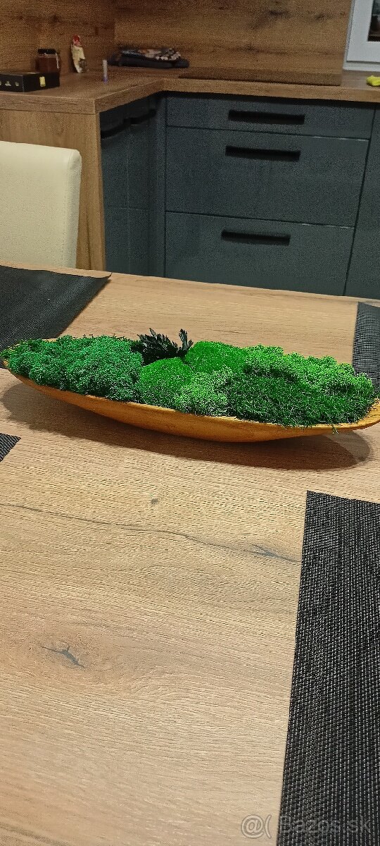 Dobrý deň, mám na predaj machovu dekoráciu na stôl, do kuchyne alebo do kúpeľne, izby. Výrobok je vyrobený z originál machu, žiadny umelý, potrebné ho mať v tmavších podmienkach bez slnečného žiarenia. Výrobok vydrží pri správnom uskladnení 7-10 rokov. Dĺžka vázy je 38cm, šírka 12cm. Cena 30€ , pošlem aj poštou. Info správou 0908586160