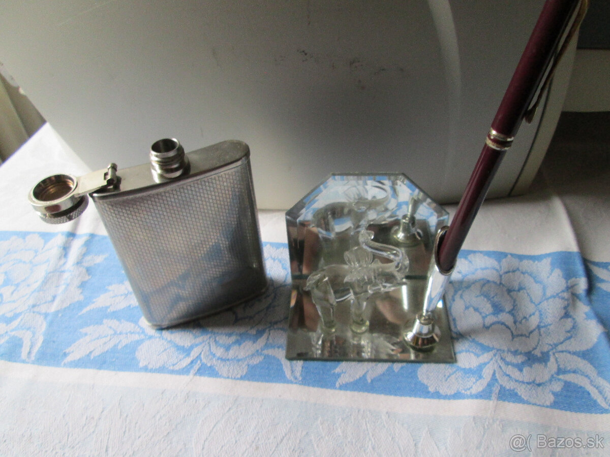 Originálny darček pre mužov - malá fľaška - ploskačka na alkohol z nerezovej ocele - objem 100 ml, vhodná do batoha na turistiku. Stojan na pero so sloníkom, na pracovný stôl, 12 eur spolu, obec Badín