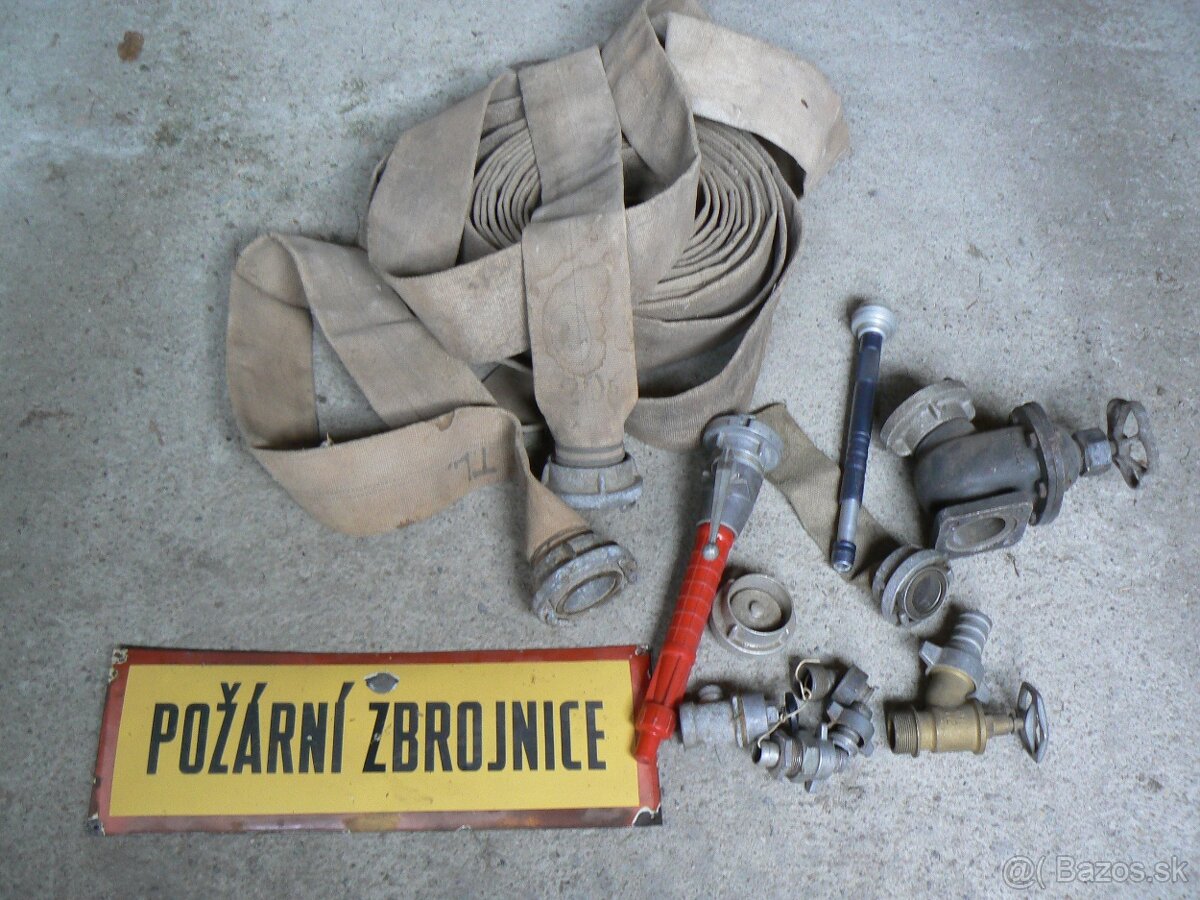 Nabízím staré hasičské věci, viz foto. Smaltovaná cedule-Požární zbrojnice-2250 kč,šoupě-2000 kč,ventil 1 1/2"-500 kč,hadice -B-1500 kč,fitinky-50kč/kus,proudnice Klimeš bez křížku-1000 kč.Zátka-C-70 kč.Plaketa 110 výročí založení hasičského sboru z povolání 1892-2002-Plzeň-2500 kč. Červená proudnice je prodaná.Možná výměna za staré vojenské hodinky.