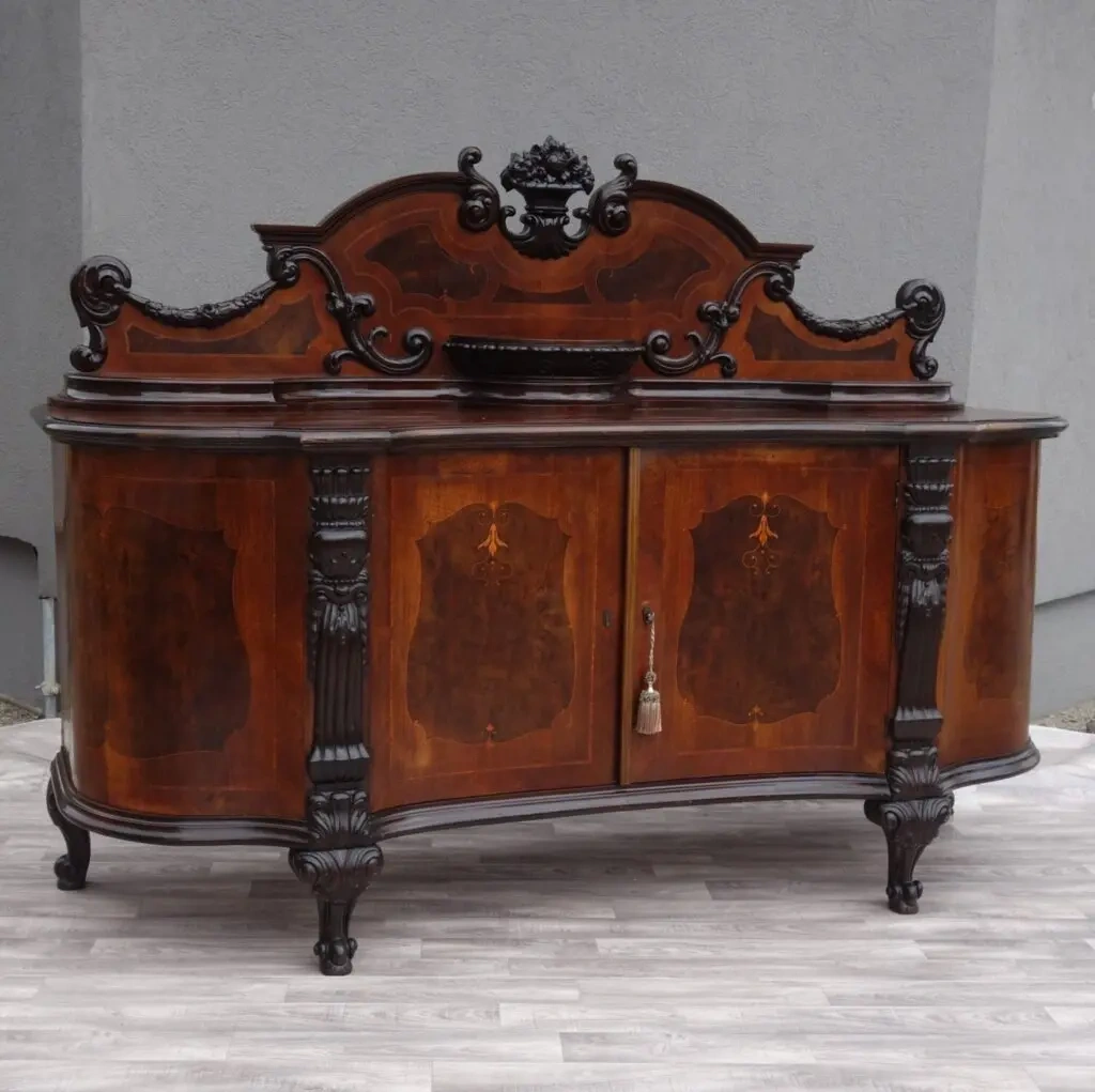 Veľkolepý starožitný viktoriánsky príborník hadovitý , mahagónový má väčšie rozmery a pochádza z obdobia cca. 1870. Má vyvýšenú odnímateľnú krásne tvarovanú a vyrezávanú zadnú časť nad vrchnou doskou . Nižšie sú 2 tvarované dvierka , ktoré sú zdobené stĺpikmi s bohatou rezbou . Vo vnútri príborníka je poličkový úložný priestor , vo vrchnej časti s jedným šuplíkom . Stojí na krásnych vyrezávaných nohách .Tento príborník bude dokonalým klenotom vo Vašom domove ,lebo taký nemá hocikto. Skladá sa z 2 častí . Vo veľmi dobrom starožitnom stave . Výška – 165 cm , šírka – 225 cm , hĺbka – 70 cm .Dovoz Holandsko. Dovoz až k Vám domov viem v rámci Slovenska zabezpečiť po dohovore zadarmo . Pozrite všetky moje inzeráty možno zaujme aj niečo iné. Uprednostňujem telefonický kontakt pred sms a emailmi. Všetko je o dohode .