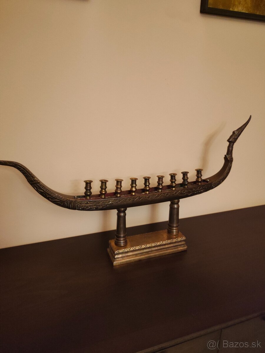 Masívny bronzový, približne 1970. 75x41x8 cm, cca 4 kg. 9 svietnikov, šťastné číslo v Thajsku. Výborný stav. Účtujem poštovné.