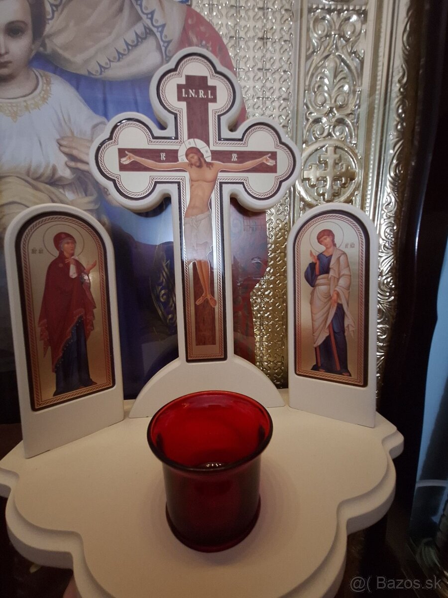 Drevená Golgota/ikonostas/ kríž /svietnik v byzantskom štýle. Rozmer 30 (výška) x27x16 cm. Cena 27,80 eur. V prípade záujmu prosím kontaktovať mailom alebo sms. Ďakujem.