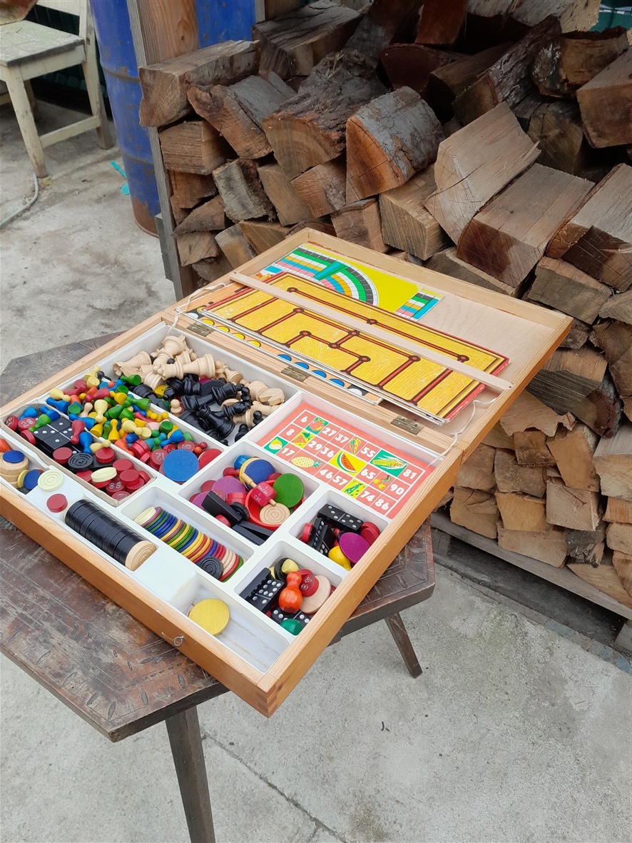 rôzne stolové hry väčšinou z dreva, drevený šach je komplet, ostatne som nepočítal, dáma domino, dostihy cena spolu aj s poštovným 55€