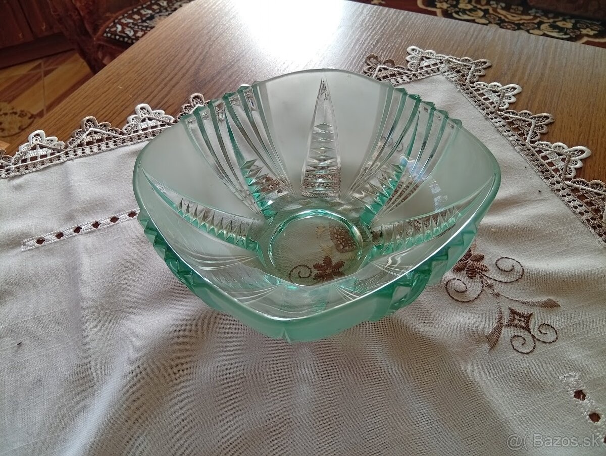 ponukam starožitnu misku na ovocie dezert z uranoveho skla v štyle Art Deco ide o lisovane sklo ktore obsahuje oxid Uranu čo mu dodava charakteristicku zeleno-žltu farbu Navrhol Schrotter pre Sklo Union 1920