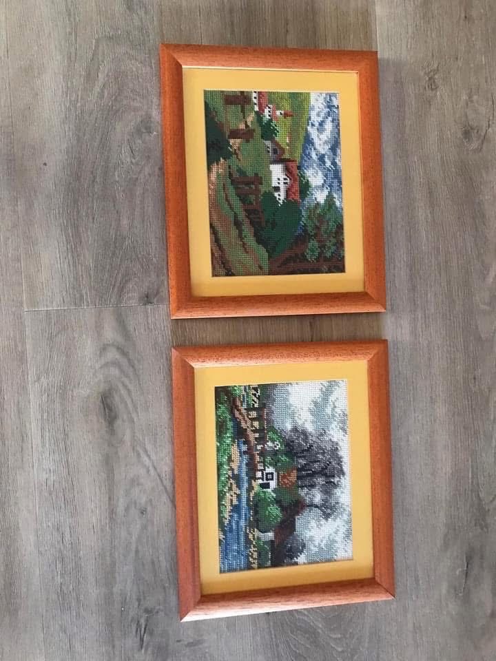 Predam rucne vysivane obrazy, zaramovane v drevenom ramiku, rozmer sirka 33,5 cm, vyska 27,5 cm, cena 10€/1 ks.