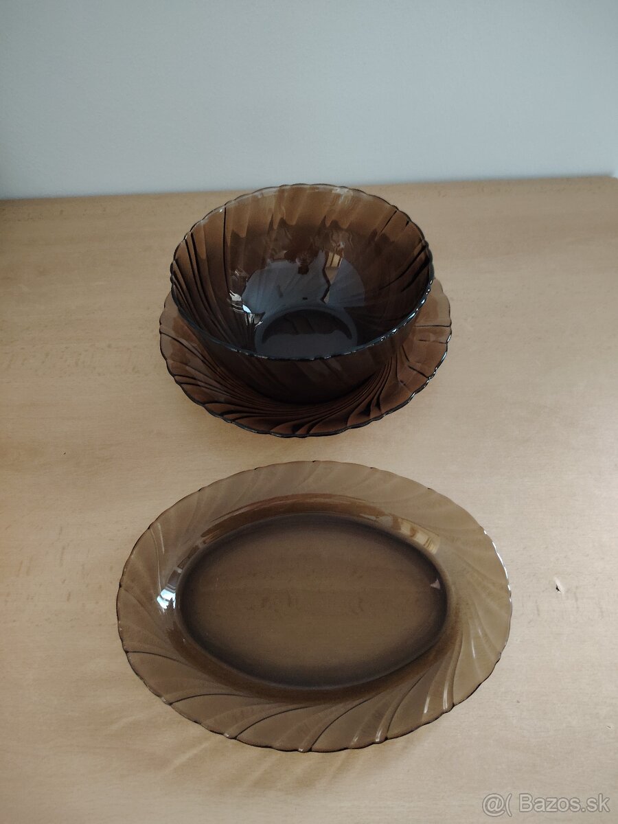 Tieto hnedé sklenené misky a taniere sú Duralex zberateľské kúsky, pravdepodobne zo série Lys Amber.