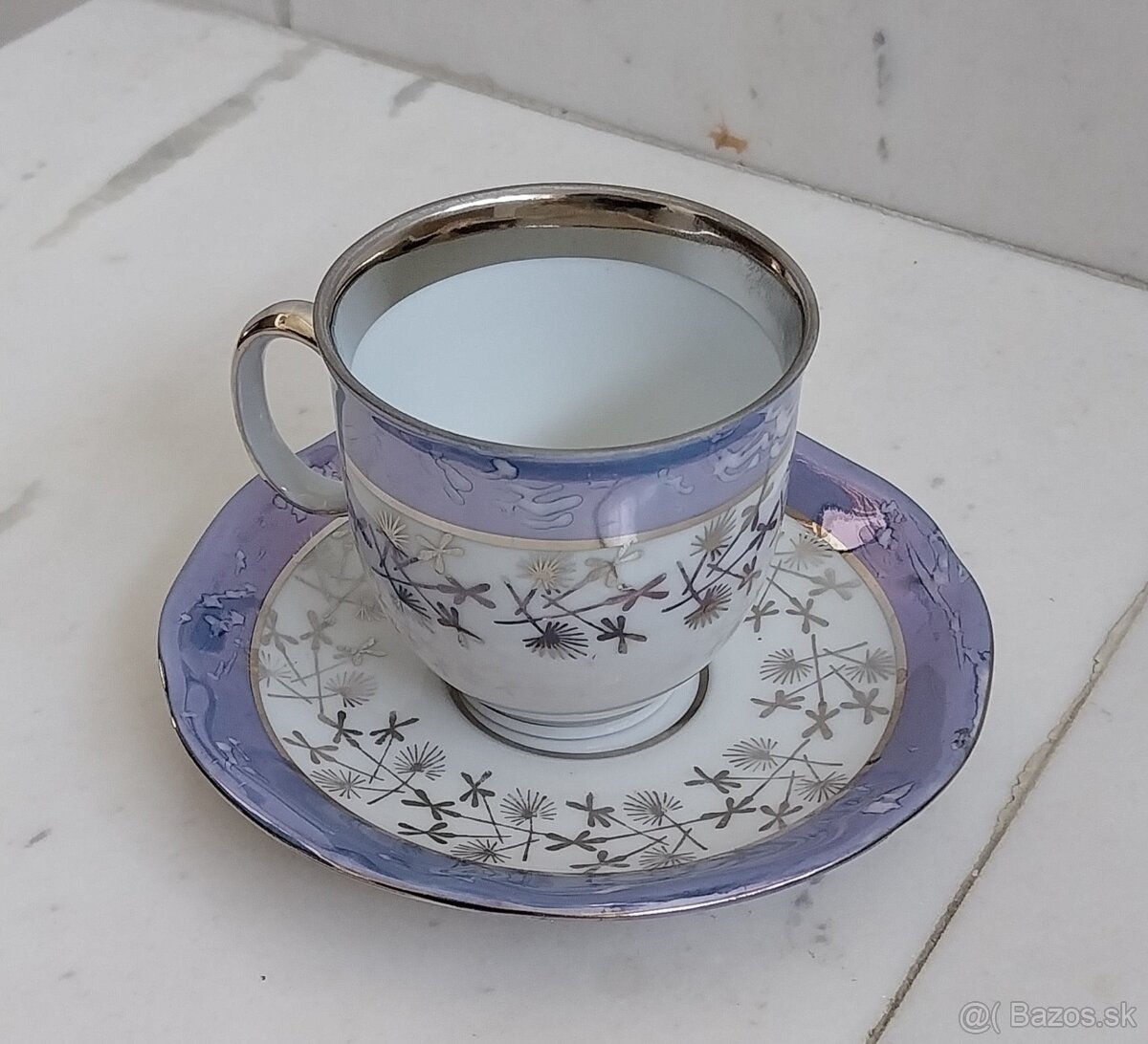 Modro, bielo, strieborné lesklé šálky, vintage. 6 šálok+ 5 podšáliek