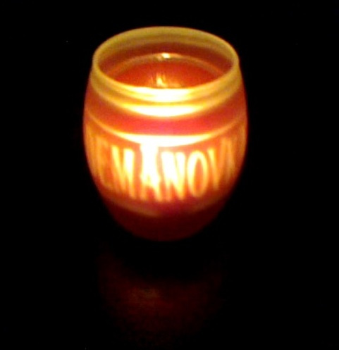 Svietnik na stôl s logom "Demänovka". Je vyrobený s mliečneho skla a do vnútra sa vkladá čajová sviečka.