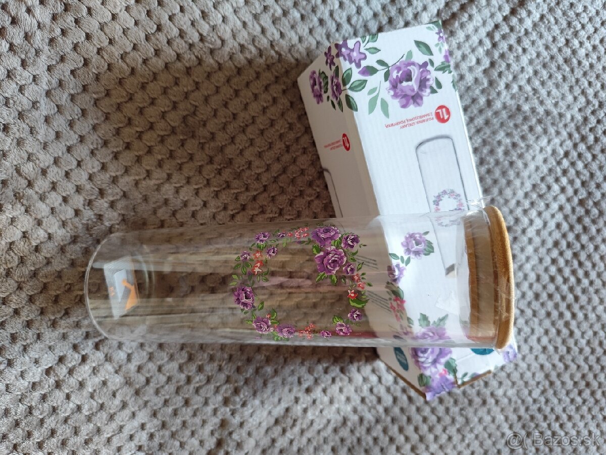 Predám novú sklenenú dózu značky Altom, zdobenú kvetinovým vzorom a s bambusovým vekom.