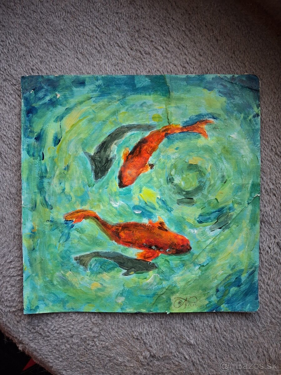 Predám ručne namaľovaný obraz oranžových kaprov v tykrisovom pozadí. Obraz je namaľovaný akrilovými farbami a je natretý lakom, ktorý mu dáva lesklý vzhľad.