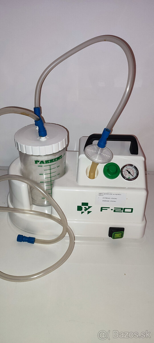 Predám odsávačku Fazzini F-20, použivaná 9 mesiacov, veľmi dobrý stav. Prenosná odsávačka pre malé chirurgické zákroky a post-tracheotómiu, pre domáce použitie. Ideálny pre domácu pooperačnú liečbu. Rôzne príslušenstvo. Parametre: