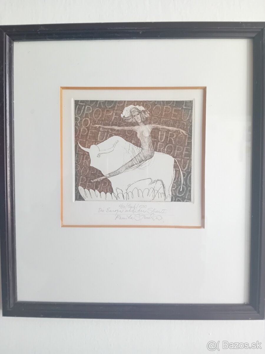 Predám zarámované grafiky Kamila Štanclová E.L. "Die Europa und der Stier I", lept, 6/50, 1990, 14x13,5cm, s rámom 25,5x 27,5cm, 55 eur, Ondrejička "Idol" 67/100, 1997, 10x15,5cm, s rámom 20x25,5cm, 110 eur.