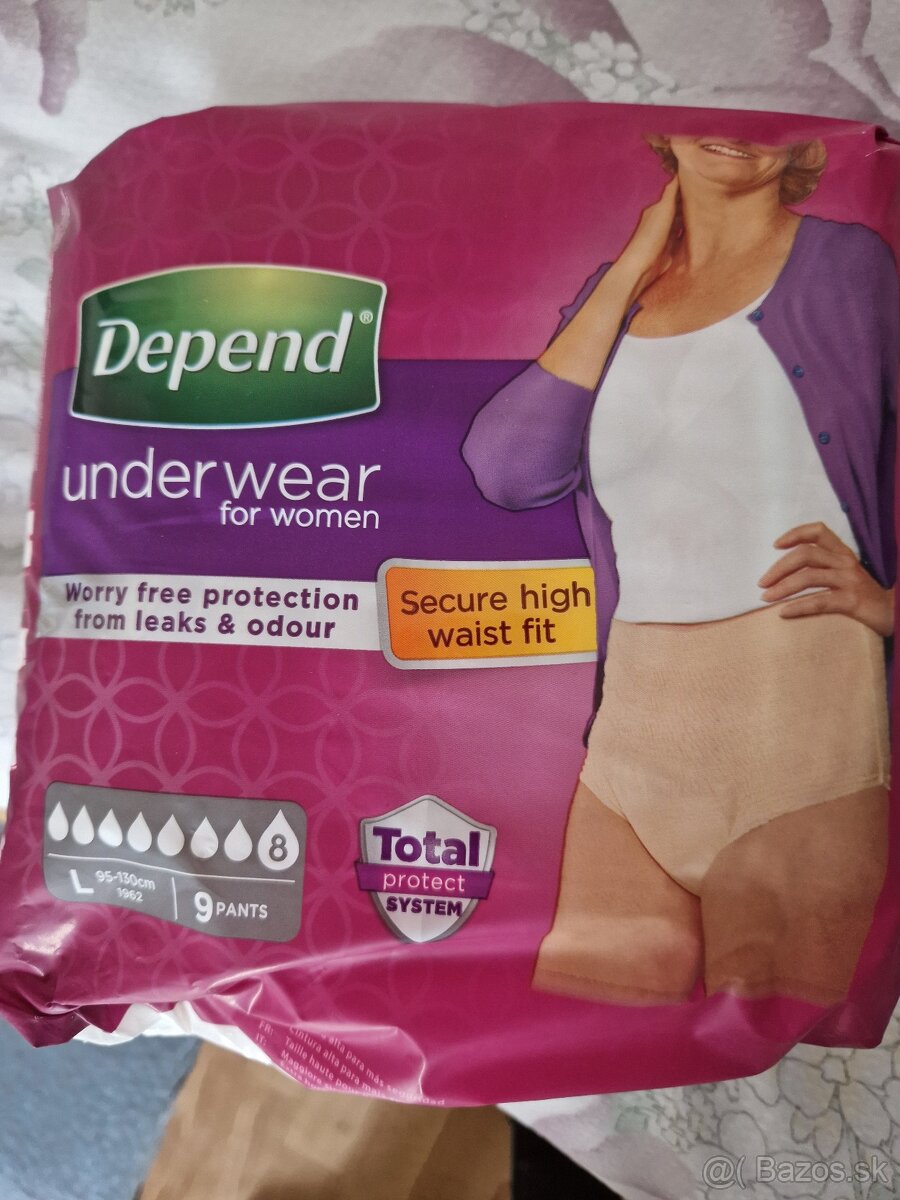 Predam damske plienkove nohavicky zn.DEPEND velkost L,v baleni je 9 ks nohaviciek.Ponukam 8 baleni, ceza za bal.je 5 eur ( v lekarni stoji 10 eur).