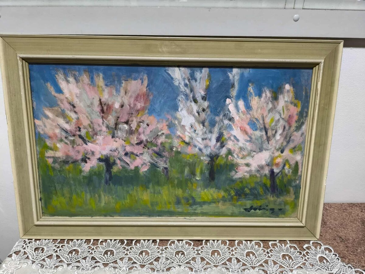 Predám krásny starý obraz Rozkvitnuty sad od známeho košickeho maliara Vojtecha Seligu, olejomaľba na sololite v ráme rozmer 69 x 44 cm, signovane, cena 169 eur plus poštovné