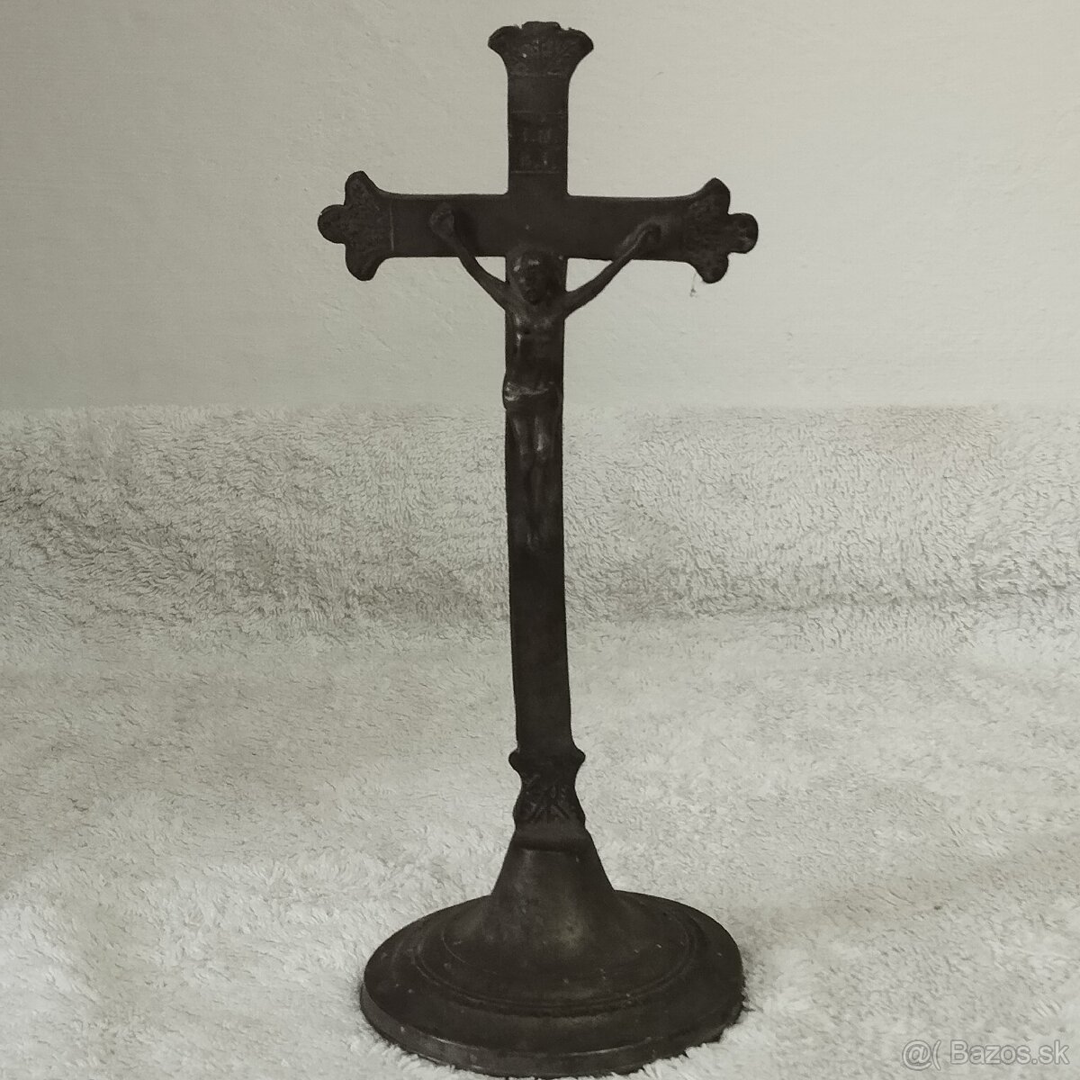 Starý kovový krucifix s podstavcom, pravdepodobne z konca 19. až začiatku 20. storočia, pochádzajúci zo strednej Európy – oblasti dnešného Česka, Slovenska či Rakúska. Vyrobený zo zliatiny mäkkého kovu, bežnej pre obdobie Rakúsko-Uhorska. Nesie nápis INRI a dekoratívne zakončenia v štýle neskorého baroka až neogotiky. Podobné kríže bývali umiestnené na domácich oltárikoch alebo v spálňach veriacich rodín. Zachovaná pôvodná patina, autentický historický vzhľad. Cena 39 eur, pri rýchlom jednaní zľava.