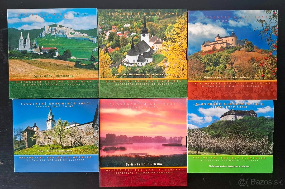 Sady mincí - Regióny Slovenska, kompletná séria 9 súborov - [8.1. 2026]Predám kompletnú sériu súborov obežných mincí SR Regióny Slovenskej republiky. Séria obsahuje deväť súborov, všetky sú v bezchybnom stave.
