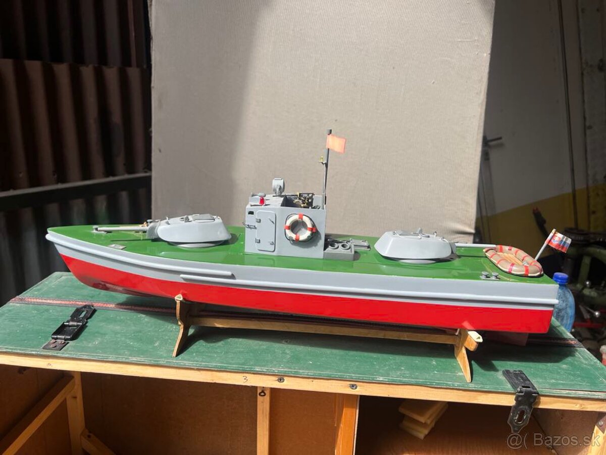 Predám drevený model lode z preglejky , delový čln 65cm dlhy 16 cm široký na vrtule má servo na kormidlo, loď je bez motorov má prepravnú bedňu veľkosti 83cm x40cm a 25cm širokej