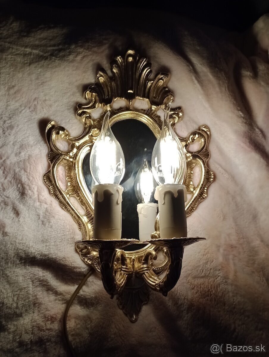 Predám ťažký mosadzny svietnik, pôvod Taliansko zámok CASAL ROMITO. Bol komplet zreštaurovaný -od mosadznych dielov až po kabeláž. Výška 33cm, šírka 21cm.