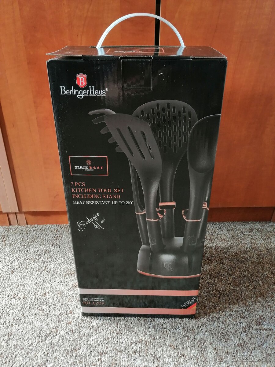 Sada kuchynského náradia Berlingerhaus je štýlová, moderná a praktická súprava. Je 7 dielna, obsahuje širokú prevracačku na rezne, vajíčko, palacinky a na hranolky, veľkú lyžicu na šťavu, pretláčatko na štuchanie zemiakov, ktoré je dostatočné pevné a zároveň ľahké do ruky. Širokú naberačku s otvormi, výbornú na miešanie a vyťahovanie zemiakových hranoliek, mäsa a zeleniny, hlbokú naberačku na polievku, a naberačku na špagety.Každý jeden kus náradia može ísť počas varenia aj do horúcej vody, alebo vriaceho oleja. Moderný materiál je kombináciou nylonu a sklených vlákien pre maximálnu odolnosť až do 230°C. Náradie je ľahučké, komfortné na úchop a ergonomicky tvarované držadlá sú protišmykovo upravené a nekĺžu sa v ruke. Jedinečnou vlastnosťou kuchynského náradia Berlingerhaus je, že ma antibakteriálny dizajn. Je vrobená z najkvalitnejšieho nylonu, vďaka ktorej počas používania nepoškriabete mramorový povrch hrncov a panvíc.