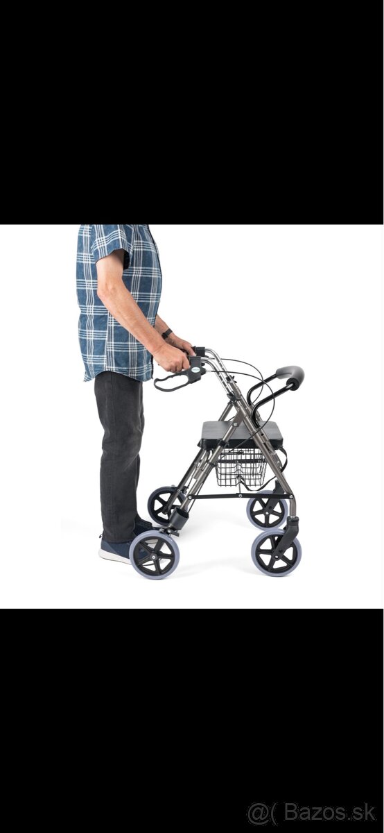 Predám odľahčené hliníkové chodítko RA882 v sivej farbe. Stabilná konštrukcia, výškovo nastaviteľné rukoväte, ručné brzdy s aretáciou a pohodlné sedadlo na oddych. Súčasťou je praktický košík na nákup.